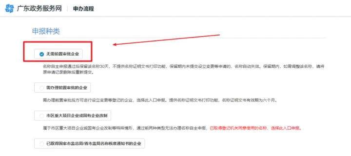 申报种类根据自身需求选择,一般为无需前置审批企业,然后点击下一步。如需前置审批或者冠省名等,需另外按照规定办理。