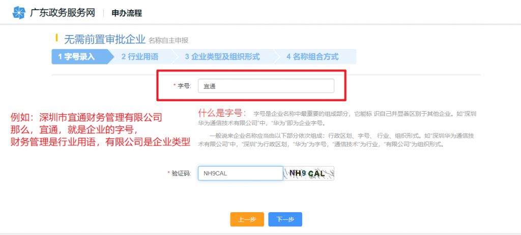 这一步是填写公司名称,一个公司的名字是由行政区域+字号+行业+企业类型构成的,例如深圳市宜通财务管理有限公司,就是深圳市(行政区域)+宜通(字号)+财务管理(行业)+有限公司(企业类型)